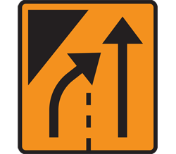 Körfält upphör. Märket anger att ett körfält tillfälligt är avstängt och att ett annat körfält kan användas i färdriktningen. Märket är anpassat efter förhållandena på platsen. Avvikelse från färg får inte ske.